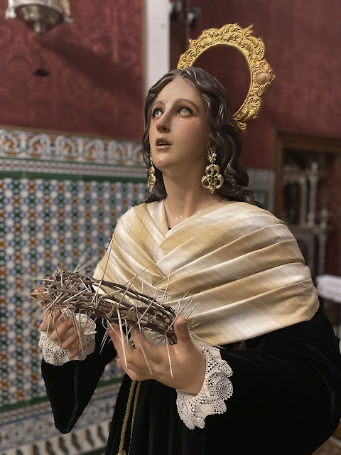 Por su parte, Santa María Magdalena se presenta con un aspecto austero portando el terno de terciopelo negro enriquecido con encajes dorados y tocado de tablas. Porta entre sus manos corona de espinas.